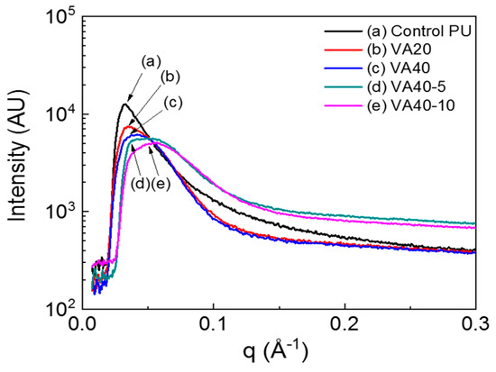 VA-based PUs synthesized in this study appeared opaque, mainly because of the crystallites formed by the hard segments. The microphase-separated structures of the VA-based PUs strongly depended on the VA/PTMEG1000 ratio. Figure 3 shows the small-angle X-ray scattering (SAXS) profiles of the control PU and VA-based PUs. The SAXS profiles confirmed the scatterings of hard and soft segments domains. The interdomain distance of hard domain in the SAXS profiles was ~20 nm, similar with the interdomain distance of the hard domains in previous studies of PUs [30,31,32,33]. The peak positions of the VA-based PUs appeared in a higher q range than in the control PU, indicating a lower interdomain distance of the VA-based PUs than that of the control PU. The interdomain distances were 19, 18, 18, and 17 nm, respectively, in the VA10, VA20, VA30, and VA40 samples; and they were 15 and 14 nm, respectively, in the VA40-5 and VA40-10 samples (in which phase mixing was induced by the m-CE). VA-based PUs exhibited much broader widths than the control PU (Figure 3 and Figure S4), implying that micro-phase separation and crystallinity were hindered by VA as well as by m-CE.