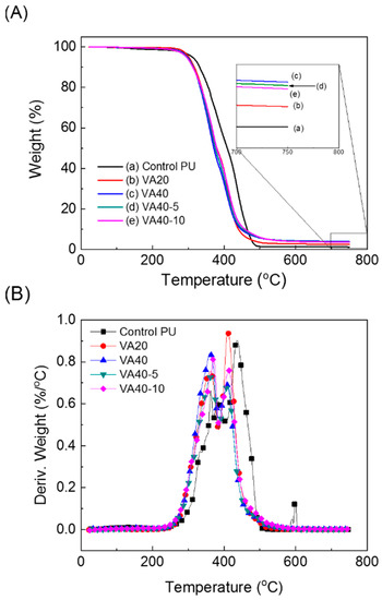 Thermogravimetric analyzer (TGA) thermograms of the VA-based PUs: (A) weight loss profiles and (B) 1st derivatives of the weight loss profile.