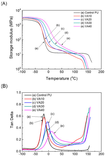 Dynamic mechanical analyzer (DMA) thermograms of the VA-based PUs: (A) storage moduli and (B) tan delta.
