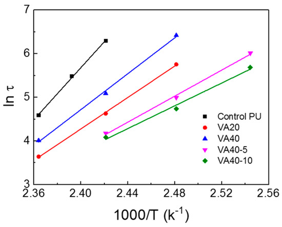 Arrhenius plots of the relaxation times τ of the VA-based PUs.