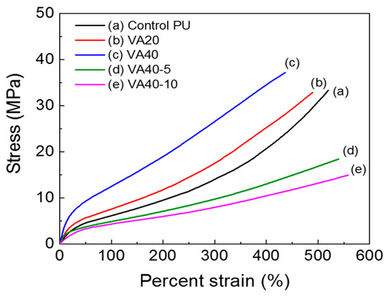 Stress–strain properties of the PUs were studied in tensile tests, and they are presented in Figure 8 and Figure S9. Interestingly, increasing the VA content improved the tensile strengths and moduli of the PUs, but it lowered the elongation at break. Figure 8 shows representative tensile properties of the synthesized PUs. The molecular weight of the VA-based PUs decreased with increasing VA content. At first glance, this trend seemed incompatible with the increasing tensile strength of VA-based PUs with higher VA content, but it can be explained as follows. When the VA content increased, the decreased molecular weight and microphase separation in the VA-based PUs were more than offset by strong hydrogen bonding; consequently, the tensile strength and modulus improved.