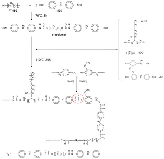 VA-based PUs were synthesized by the prepolymer method. The prepolymer was synthesized by reacting 0.1 mol of PTMEG1000 and 0.2 mol of MDI at 70 °C for 3 h. The synthesized prepolymer was mixed with the desired amounts of MDI, BDO, m-CE, and VA. After degassing, the mixtures were poured into a glass mold to prepare PU films and cured at 110 °C for 24 h in a convection oven. PU films obtained after the cure were employed for characterizations.