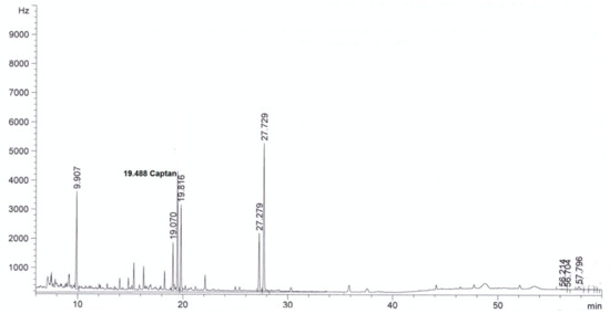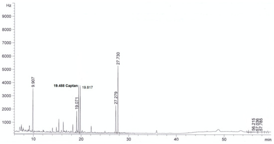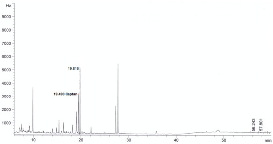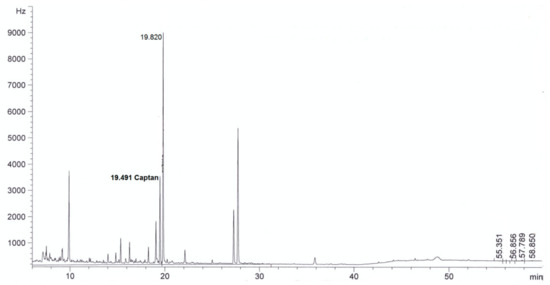 Furthermore, the concentrations of captan in wastewater extracts were determined by gas chromatography (GC) combined with electron capture (μECD) detection (7890A system, (Agilent Technologies, Palo Alto, CA, USA). A quantity of 2 µL of samples were injected in splitless mode on a HP-5 MS Ultra Inert/30 m × 0.25 mm I.D. × 0.25-µm column. The carrier gas was helium with a flow 3.7 mL/min. The temperature of the injector and detector were 250 and 300 °C, respectively. The Agilent Technologies ChemStation, Rev. B04.03-SP2(108) package was used as software for processing the analysis results [35].