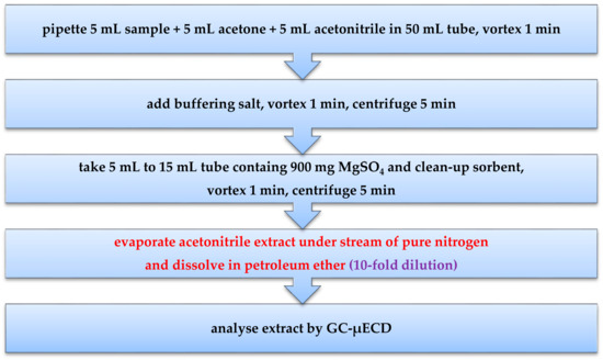 The wastewater from a plant protection products factory (A-sample and B-sample) was analysed for selected physicochemical parameters. All analysis was conducted according to ISO procedures (see Table 1). Modification of the QuEChERS method [7], which is used for pesticide residues analysis in food of plant origin was carried out to adapt it to wastewater samples. In the original method, the mass of a sample used ranges from 2 to 10 g, depending on the type of sample. In the case of samples with low water content, before extraction, water was added to samples. Then, 10 mL of acetonitrile was added before the extraction step. In our study, in the extraction step, instead of 10 mL acetonitrile, 10 mL acetonitrile:acetone mixture (1:1 v/v) was added, along with 5 mL of the wastewater sample, into a 50 mL disposable polypropylene centrifuge tube. In the case when only acetonitrile was added to the sample, three layers were formed and further analysis was impossible. Our modification allows for the creation of a homogenous solution. The content of the centrifuge tube was vortexed by mixer (BenchMixerTM, Benchmark, Edison, NJ, USA) for 1 min. Then, a mixture of salts containing 4 g of anhydrous magnesium sulfate, 1 g of sodium chloride, 1 g of trisodium citrate, and 0.5 g of disodium hydrogen citrate sesquihydrate were added. The content was vortexed by a mixer (BenchMixerTM, Benchmark) for 1 min and then centrifuged for 5 min at 3000 rpm (MPW-350R, MPW MED. INSTRUMENTS, Warszawa, Poland). A quantity of 5 mL of the acetonitrile phase was transferred to a 15-mL disposable polypropylene centrifuge tube that contained 900 mg of anhydrous magnesium sulfate and the appropriate sorbent for clean-up. In this step, five sorbents were tested: Florisil® (1 g), Al2O3 (1 g), ZrO2 (1 g), SiO2 (0.15 g), and PSA (0.15 g). The content of the tube was vortexed for 1 min by mixer (BenchMixerTM, Benchmark) and centrifuged for 5 min at 3000 rpm (MPW-350R, MPW MED. INSTRUMENTS). A total of 1 mL of obtained extract was transferred to a volumetric flask, acetonitrile extract was evaporated to dryness under a stream of pure nitrogen and then dissolved in 10 mL of petroleum ether (Chempur) (see Figure 8). Six replicates of each sample were analysed.
