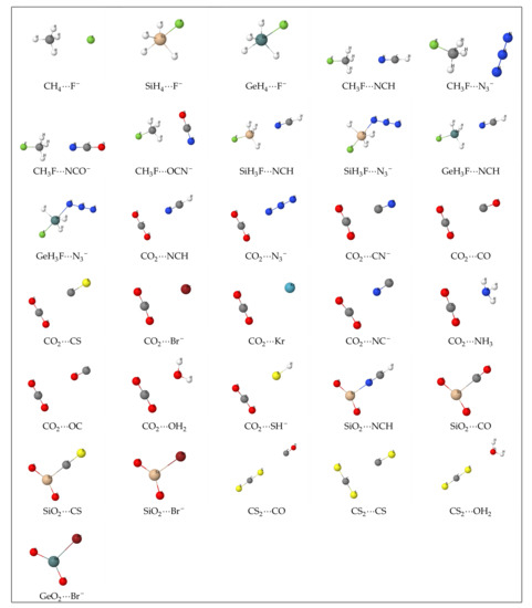 There has been a growing interest in the last years in the field of non-covalent interactions (NCI) [1], which have been shown to be critical for the correct description of the structure and properties of different molecules and materials [2,3], including nanomaterials [4,5], molecular solids [6,7], surfaces [8,9], and biological systems [10,11,12]. From the many types of interactions that are usually classified as non-covalent, hydrogen bonding A−H···D [13,14], where A is a group more electronegative that H and D is an entity able to act as an electron donor, is undoubtedly the best-known by all chemists. Besides hydrogen and halogen bonding [15,16] (possibly the best-known type of NCI after the former), other purported NCIs involving atoms of groups 14, 15, and 16 (and even rare gas atoms [17,18]) have recently received the names of tetrel, pnictogen [19,20], and chalcogen bonding, respectively, although some of these complexes were identified and characterized by different experimental techniques long before they were given these names [19]. In all of them, the 14, 15, or 16 group element, acting as an electron acceptor or electrophilic site, seeks the nucleophilic part of another system, for instance an atomic or molecular anion (F-,Br-,⋯,CN-, NC-,N3−,⋯), a electron pair of a Lewis base, or a non-bonding electron pair of an arbitrary molecule. As far as tetrel bonds are concerned, and to name just a few works, Bürgi et al. pioneered the study and description of nucleophilic additions to carbonyl C-atoms or interactions [21,22,23], recognized by several authors as important to biology [24,25,26], and Thomas et al. found experimental evidence for carbon bonding (an interaction where a carbon atom acts as an electrophilic site toward a variety of nucleophiles) in the solid state from X-ray charge density analysis [27]. Southern and Bryce presented results for NMR parameters of a series of model compounds in which a tetrel bond between a methyl C atom and the N or O atom of several functional groups is found [28]. Scilabra has shown that contacts between a Ge or Sn atom with different lone-pair-possessing atoms in crystal structures are quite common [29], and Mitzel and Losehand found crystal structures of Si(ONMe) with a short-distance Si–N bond [30]. A particularly relevant mention is also the work of Bauzá, Frontera, and Mooibroek, who pioneered tetrel interactions and wrote several interesting reviews on the topic [31,32,33,34,35].