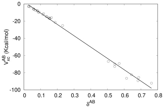Although Equation (12) is approximate even when A and B are atoms and the average distance between fragments (say ) can be different in each of the studied complexes, a linear correlation exists between , the exchange-correlation interfragment energy, and , the covalent bond order between these fragments [80]. The more significant deviations from the trend in the lower part of Figure 2 (high values) is due to two reasons. The first one is that Equation (12) is only approximate. As the fragments are formed with heavier and/or more polarizable atoms, higher multipolar contributions to become more important, making Equation (12) increasingly inaccurate. Secondly, in these cases, the multipolar expansion itself, regardless of the maximum order to which it is carried out, is no longer valid for short-range energy components (not only in but also in ) are essential due penetration energy contributions. Of course, the analysis of the degree of compliance of Equation (12) in the present context can be refined. For instance, labeling and the atoms of A and B, respectively, and are exactly given by and , and the exchange-correlation energy between atoms and can be approximated as . Hence,