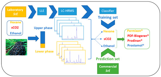 Figure 1. The workflow chart of liquid chromatography-mass spectrometry (LC-MS)-based metabolomic approach: Laboratory and commercial SrE were submitted to a liquid-liquid extraction (LLE) prior to LC-HRMS profiling. A statistical model was set up using laboratory SrE as a training set to classify samples according to their extraction process. Commercial SrE were inserted into the model to predict their respective extraction solvent. Laboratory samples: sCO2, supercritical carbon dioxide; EtOH: ethanolic; Hexane: hexanic. Commercial samples: PDF-Biogaran® and Prodinan® (sCO2), Prostamol® (EtOH), Permixon® (Hexane).