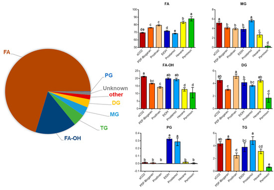 Figure 2. The mean relative content of the main chemical classes for all SrE samples (left, pie chart) and for each sample group (right, bar plots) according to identified features from the LC-MS dataset. One-way ANOVA and Tukey’s post-hoc test (DF = 6.24; p ≤ 0.01) were used to assess significant differences among sample groups denoted by a–e letters. FA: free fatty acids; FA-OH: hydroxylated/oxo-fatty acids; MG: Monoglycerides; DG: Diglycerides; TG: Triglycerides; PG: phosphorylated glycerides. Laboratory samples: sCO2, supercritical carbon dioxide; EtOH: ethanolic; Hexane: hexanic. Commercial samples: PDF-Biogaran® and Prodinan® (sCO2), Prostamol® (EtOH), Permixon® (Hexane).