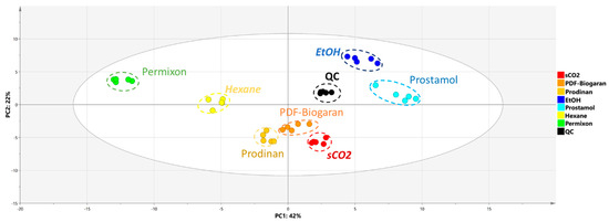 Figure 3. PCA score plot of LC-MS dataset (dotted circles highlight each class for visualization purpose). Laboratory samples: sCO2, supercritical carbon dioxide; EtOH: ethanolic; Hexane: hexanic (two superimposed dots observed). Commercial samples: PDF-Biogaran® and Prodinan® (sCO2), Prostamol® (EtOH), Permixon® (Hexane). QC: quality control samples.