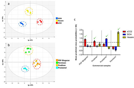 Figure 4. OPLS-DA model based on the solvent extraction process (a) the score plot using a laboratory extraction process as the Y class and selected features ranked by ANOVA in X. (b) the projection of commercial samples on the same score plot. (c) The bar plot of the predicted class probabilities of each commercial sample in their respective extraction process. A value above 0.5 indicates a high level of confidence in the predicted class. Laboratory samples: sCO2, supercritical carbon dioxide; EtOH: ethanolic; Hexane: hexanic. Commercial samples: PDF-Biogaran® and Prodinan® (sCO2), Prostamol® (EtOH), Permixon® (Hexane).