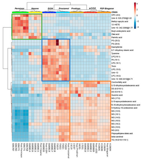 According to the OPLS-DA model described above, 52% of the total features detected are directly impacted by the extraction solvent used. To identify the main biomarkers of each extraction process, the 40 top very important parameters (VIP) ranked features from the OPLS-DA model were selected to build a clustered heatmap (Figure 5).
