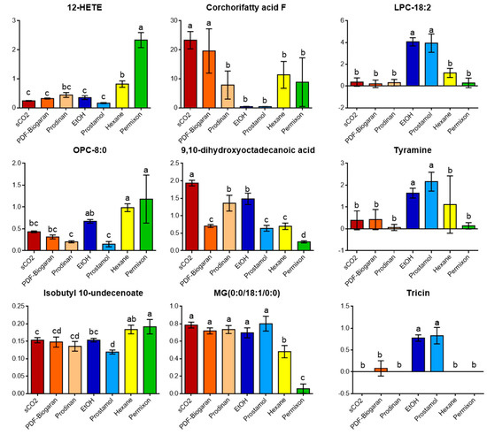 Figure 6. The relative chemical content of annotated biomarkers for each extraction process. The relative mean peak area (±SD) detected in laboratory and commercial samples. One-way ANOVA and Tukey’s post-hoc test (DF = 6.24; p ≤ 0.01) were used to assess significant differences among sample groups denoted by a–d letters. Laboratory samples: sCO2, supercritical carbon dioxide; EtOH: ethanolic; Hexane: hexanic. Commercial samples: PDF-Biogaran® and Prodinan® (sCO2), Prostamol® (EtOH), Permixon® (Hexane). OPC (8:0): 10,11-dihydro-12-oxo-15-phytoenoic acid; 12-HETE: 12-Hydroxy-5,8,10,14-eicosatetraenoate; MG: monoglyceride; LPC: Lysophosphatidlycholine. Putative annotations were based on HRMS and MS/MS spectra and in silico or experimental matches (See material and methods for details).