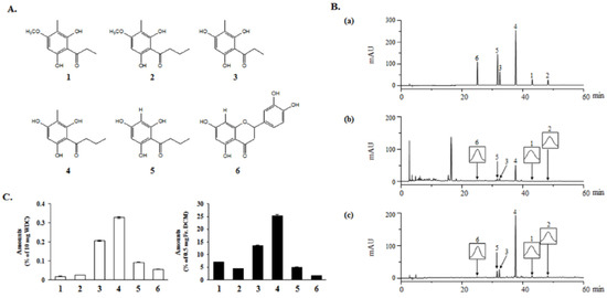 The DCM fraction was further separated by column chromatography, using silica gel and preparative HPLC, and six compounds were isolated. Their chemical structures were determined by an extensive analysis of the physicochemical and spectroscopic data, such as 1H-NMR, 13C-NMR, and LC/MS analyses, as well as by comparisons with the literature. This led to their identification as five acylphloroglucinols, namely aspidinol P (1) [24], aspidinol B (2) [25], propionyl-3-methylphloroglucinol (3) [25], butyryl-3-methylphloroglucinol (4) [25], and butyrylphloroglucinol (5) [25], as well as one flavonoid, eriodictyol (6) [12,26] (Figure 2A).