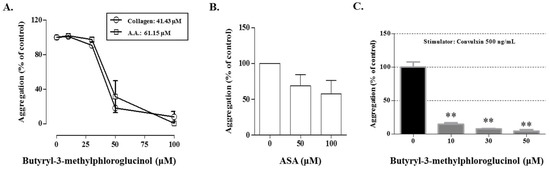 To confirm the antiplatelet activity, the effects of these compounds were investigated on the collagen-, AA-, or thrombin-stimulated platelet aggregation. As shown in Figure 3, aspidinol B (2), butyryl-3-methylphloroglucinol (4), and butyrylphloroglucinol (5) markedly suppressed the collagen-induced platelet aggregation. In particular, at a concentration of 100 μM, butyryl-3-methylphloroglucinol (4) inhibited the collagen and AA-induced platelet aggregation by 92.36% and 89.51%, respectively, without cytotoxicity (Figure 3A,B). At the same concentrations, aspidinol P (1) and propionyl-3-methylphloroglucinol (3) weakly inhibited the collagen-induced platelet aggregation only. The tested compounds had no antiplatelet effects (Figure 3C) on inducing the platelet aggregation with thrombin. Eriodictyol (6) did not show antiplatelet activity under any induction conditions. Under the same conditions, butyryl-3-methylphloroglucinol (4) showed IC50 values of 41.43 and 61.15 μM in collagen (5 μg/mL)- and AA (100 μM)-induced the platelet aggregations in vitro, respectively, whereas the IC50 values of acetylsalicylic acid (ASA) were determined to be 100 μM or more for the collagen-induced platelet aggregation, which represented a stronger antiplatelet activity than that of ASA (Figure 4). In addition, to demonstrate the mechanism of butyryl-3-methylphloroglucinol, we investigated the effect on convulxin, which is a specific stimulator against the collagen receptor GPVI-induced platelet aggregation [27]. Butyryl-3-methylphloroglucinol potently inhibited the platelet activation at a concentration of 10 μM or more.