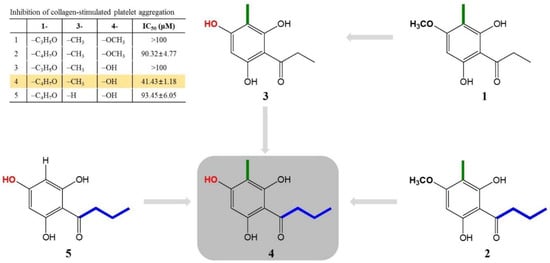 Interestingly, the structural properties and antiplatelet activities of five compounds (1–5) allowed us to make inferences regarding the structure–activity relationship (SAR). When we compared aspidinol P (1) and butyryl-3-methylphloroglucinol (4), we inferred that butyryl-3-methylphloroglucinol (4) had a strong activity because of a butanonyl group located at C-1, while aspidinol P (1) contains a propanonyl group, resulting in no activity (IC50 > 100 μM). Therefore, the presence of a butanonyl group at C-1 is likely to be a key functional element. On the other hand, compared with aspidinol B (2), butyryl-3-methylphloroglucinol (4) contains a hydroxy group at C-4, while aspidinol B (2) contains a methoxy group, which also resulted in a weak activity (IC50 = 90.32 μM). This suggests that the hydroxy group plays an important role in the antiplatelet activity. Furthermore, comparing the IC50 values and structures of butyryl-3-methylphloroglucinol (4) and butyrylphloroglucinol (5), the methyl group at C-3 was also considered a key functional element. In conclusion, a butanonyl group (C-1), a methoxy group (C-4), and a hydroxy group (C-3) were identified as functional groups in the present SAR study, and the observed activity was proportional to the number of functional groups of each isolated compound (Figure 5). In the present study, butyryl-3-methylphloroglucinol (4) potently showed an antiplatelet effect, so we are conducting further studies to demonstrate that the antiplatelet efficacy of butyryl-3-methylphloroglucinol (4) occurs through an antagonistic activity against a major collagen receptor.