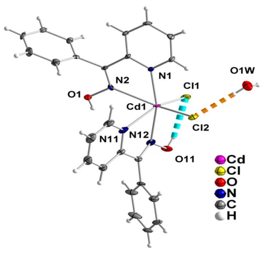 The molecules [CdCl2(phpaoH)2] and H2O that are present in the crystal structure of 1∙H2O. The thermal ellipsoids are presented at the 50% level. Only diagnostic atoms have been numbered. Dashed lines indicate hydrogen bonds in which the symmetry operation is x, y, z. Through the hydrogen bond indicated with the orange color, molecular pairs of the type {[CdCl2(phpaoH)2] − H2O} are formed in the crystal.