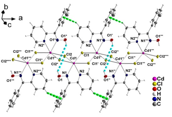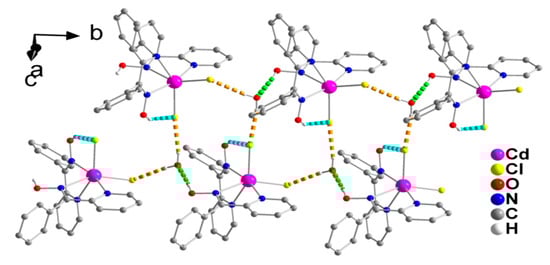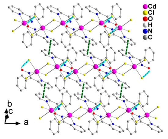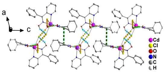 The complex [CdCl2(phpaoH)2] and solvent H2O molecules form double chains (1D), which are parallel to the b axis (Figure 3) through O1-H(O1)∙∙∙O1W, O1W-HA(O1W)∙∙∙Cl2, and O1W-HB(O1W)∙∙∙Cl1 H bonds. Each lattice H2O is connected to three complex molecules.