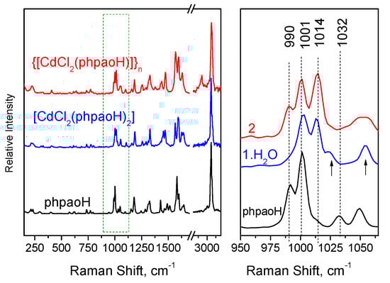 The specific spectral window of the FT-Raman spectra, where major spectral changes occur, is separately shown in Figure 7, right. These spectral changes are attributed to pyridine ring-breathing vibrations [49]. Compound phpaoH exhibits Raman peaks at 990 and 1032 cm−1 assigned to totally symmetric ring-breathing and trigonal ring deformation modes, respectively [50,55,56]. In both 1∙H2O and 2, a new Raman band appears at 1014 cm−1. Similar behavior has been observed (a) for complexes with the formulae NiCl2(py)2 and CoCl2(py)2 relative to the spectrum of pyridine (py), and (b) after adsorption of pyridine on transition metal electrodes [57]. A note is made of the fact that the Raman band at ~1000 cm−1 is characteristic of the mono-substituted benzene ring.
