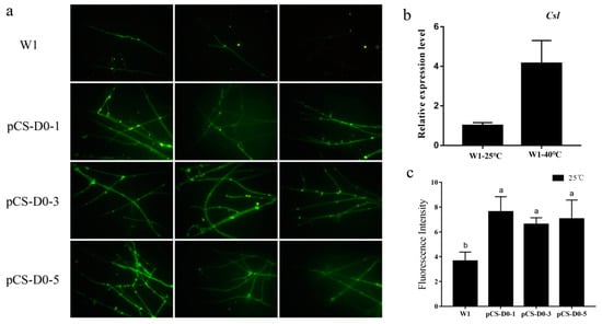 (a) Mycelia of pCS-D0 transformants observed with an OLYMPUS BX51 fluorescence microscope compared to wild-type W1; images were taken with a 40× field of view. (b) Relative expression level of Csl before and after heat stress in wild-type W1. (c) The fluorescence intensity of pCS-D0 transformants; n = 3, p < 0.01.