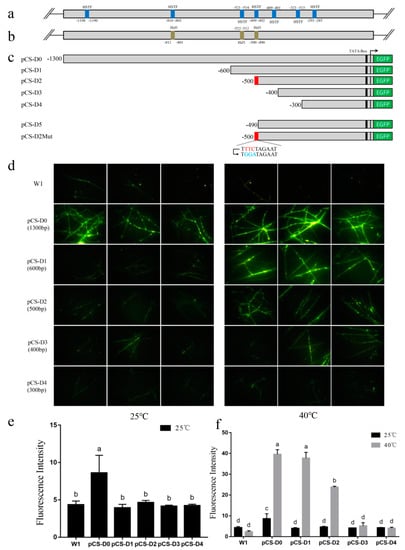 After heat shock for 24 h, the fluorescence intensity of pCS-D0, pCS-D1, and pCS-D2 transformant mycelia significantly increased; however, the pCS-D3 and pCS-D4 transformants showed no significant change. The results indicated that pCS was an inducible promoter which can respond to heat stress and the heat-inducible element could be located between −500 bp and −400 bp. The fluorescence intensity in all truncated constructs showed that the predicted HSTF binding sites, which were located between +891 bp and +1015 bp and +102 bp and +497 bp, are not the functional element. Combined with the results of the bioinformatic analysis of the full-length pCS, two heat shock transcription factor (HSTF or Hsf1) binding domains were exactly located in this region (−490 bp to −500 bp and +891 bp to +899 bp), but only one of them was predicted by SCPD and Yeastract simultaneously (−490bp to −500bp). Then, it was considered as the supposed heat-inducible element.