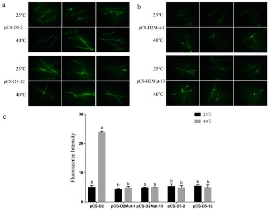 (a) Mycelia of pCS-D5 transformants before and after heat stress observed with an OLYMPUS BX51 fluorescence microscope; images were taken with a 40× field of view. (b) Mycelia of pCS-D2Mut transformants before and after heat stress observed with an OLYMPUS BX51 fluorescence microscope; images were taken with a 40× field of view. (c) The fluorescence intensity of pCS-D5 and pCS-D2Mut transformants before and after heat stress; n = 3, p < 0.01.