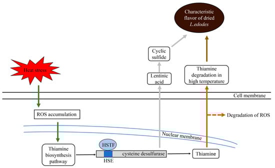 Lentinula edodes is a delicious edible mushroom, with a unique volatile flavor, but the mechanisms of the volatile sulfide generation by heat stress is still at the protein level. The main contribution of this work is to advance the mechanisms of flavor formation at the molecular level. Combining the results of this paper, we speculate that the mechanisms of the volatile sulfide formation in the process of hot-air drying of L. edodes is as follows: In the early stage of the hot-air drying process, the water activity remains at a high level and the metabolic process still proceeds. It has been reported that the oxidative stress response was stimulated by high temperature during the early stage []. We suggest that cysteine desulfurase is activated by the oxidative stress because it is the first enzyme in the thiamine metabolic pathway while thiamine is closely related to the oxidative stress [,]. Thiamine metabolic pathway is activated to reduce the damage to mycelia under the oxidative stress. In this process, the HSTF binds with the heat-inducible element which locates between −500 bp and −490 bp in pCS and enhances the transcriptional activity of the Csl gene, causing the accumulation of cysteine desulfurase. Subsequently, with the temperature rise and the water desorption, a large number of enzymatic reactions occur to generate volatile sulfide, including the reaction catalyzed by cysteine desulfurase with lentinic acid as the substrate. In the later stage of the drying process, non-enzymatic reactions such as a Maillard reaction occurs. Thiamine can degrade and generate volatile sulfide as well []. All these reactions contribute to the characteristic flavor for L. edodes. The proposed model of the formation of volatile sulfide generated by cysteine desulfurase during the hot-air drying process is shown in Figure 4.
