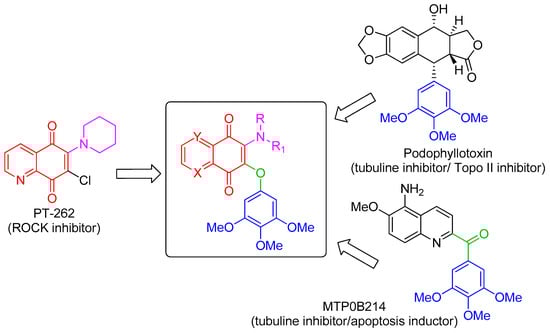 The 3,4,5-trimethoxyphenyl (TMP) unit is a structural feature of anti-neoplastic molecules. It is the case of the natural phenols combretastatins, whose biological activities have been attributed to the presence of this moiety’s ability to target tubulin by the inhibition of microtubule formation. Other representative examples are given by colchicine and podophyllotoxin (Figure 1) [6], which make this pharmacophore a peculiar structural motif among the effective tubulin inhibitors studied in the last decades, with a special value in the design of new antitumor drugs. In addition, podophyllotoxin derivatives acting as topoisomerase II inhibitors are drugs commonly used in clinical oncology [7]. MPT0B214, also showing the TMP unit (Figure 1), inhibits tubulin polymerization and induces apoptosis through mitochondria-mediated pathways [8]. Naphthoquinone and quinolinequinones cores are other representative chemical scaffolds for the development of antitumor agents, which are present in structures of natural and synthetic bioactive products [9,10]. Their molecular mechanism includes reactive oxygen species (ROS) generation mediated by naphtoquinone oxidoreductase 1 (NQO1) bioreduction [11]. Quinolinequinone is a structural unit also present in 7-chloro-6-piperidinyl-quinoline-5,8-dione (PT-262, Figure 1), a synthetic molecule showing an effective inhibition of ROCK kinase activities [12].