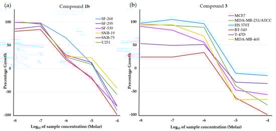 Dose response curves at NCI fixed protocol: (a) for compound 1b on the indicated central nervous system (CNS) cancer cell lines, and (b) for compound 3 on the indicated breast cancer cell lines. The curves were obtained at five concentrations (log dilutions from 10–4 to 10–8 M). The concentrations of each compound, which inhibited 50% of cancer cell growth (GI50), were deduced and are the values reported in Table 1.