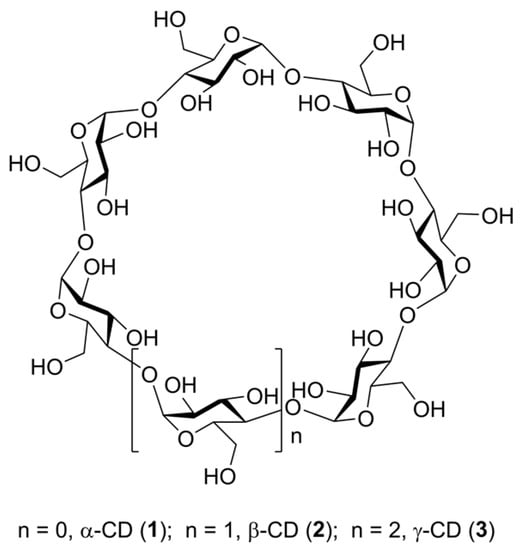 A general structural formula of α-, β-, and γ-cyclodextrins (1–3).
