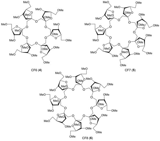 Cyclofructans (CFs), isomers of CDs, are the second class of carbohydrate macrocycles. The most studied of them are hexakis-β-(2→1)-fructofuranose (CF6, 4), heptakis-β-(2→1)-fructofuranose (CF7, 5), octakis-β-(2→1)-fructofuranose (CF8, 6) (Figure 3). In ESI positive ion mode mass spectra, permethylated CFs associate with alkali-metal ions, for CF6, the affinity changes in order of K+ > Rb+ > Cs+ > Na+, for CF7, Rb+ >K+ > Cs+ > Na+ (solutions in acetone) []. Intact CFs also form 1:1 aggregates with alkali metal ions (for extensive ESI MS and DFT molecular modeling studies see []). CFs possesses hydrophobic cavities (however, not as prominent as those of CDs) and, hence, are capable of forming inclusion complexes with hydrophobic compounds, e.g., amino acids [] (compare to CDs: [,,]), so despite a different carbohydrate composition, CDs and CFs have similar properties.
