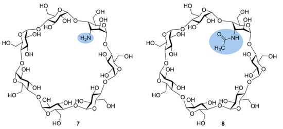Structural formulas of monosubstituted 3-amino β-CD 7 and 3-acetamido β-CD 8 []. Nitrogen-containing functional groups are highlighted.