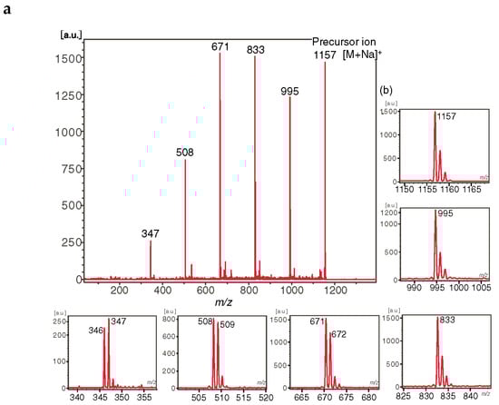 LID MALDI TOF/TOF MS of ions generated from 7. (a) MS2 of [M + Na]+ ion, extensions of isotopic clusters are presented in insets; (b) MS2 of [M + H]+ ion (reproduced from [], Open Access material under the Creative Commons license.).