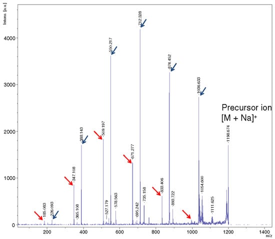LID MALDI TOF/TOF MS of the [M + Na]+ ion generated from 7. Peaks of NHAc-containing ions are marked by blue arrows, and red arrows show peaks of ions with no nitrogen (reproduced from [], Open Access material under the Creative Commons license).