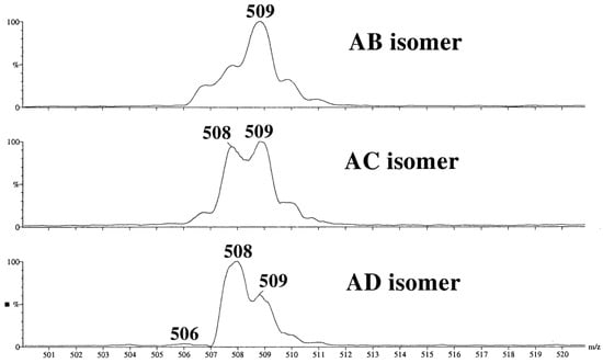 It is difficult to discuss a similar early study [] because the data obtained there look unreliable, at least, in part. Because a monoquadrupole, low resolution instrument was available, unselective CID was achieved by applying an elevated cone voltage (190 V). Nevertheless, CID pseudo-MS2 of [M + Na]+ of three 6,6′-diamino β-CDs 9b–11b seem to be conclusive. Really, in the range of sodiated three-residues ion (m/z 507 to m/z 511, Figure 13) the differences between AB, AC, and AD isomers were clear despite of incomplete resolution of the peaks: the absence m/z 507 peak for AD, m/z 509 was the highest for AB, and for AC, comparable intensities of m/z 508 and m/z 509 were observed (the hypothesis of random cleavage of glycosidic bonds in [M + Na]+ was later proved for a monoamino derivative [], see above). Three isomeric tosylates and two isomeric mesitylates were studied without independent determination of their structures hence the assignments in the second part of the study cannot be considered as reliable.