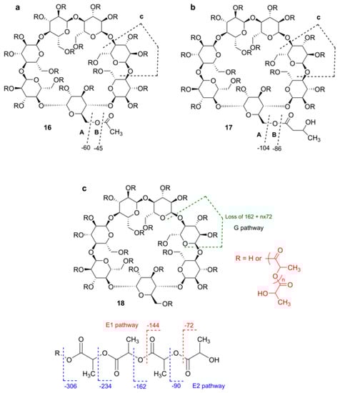 Fragmentation of acylated β-CDs according to Peptu et al. (a) totally acetylated, TABCD []; (b) randomly 3-hydroxybutyrated, HBCD []; (c) oligolactate []. (Open Access material under the Creative Commons license).