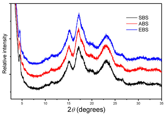 X-ray diffraction patterns of SBS, EBS and ABS.