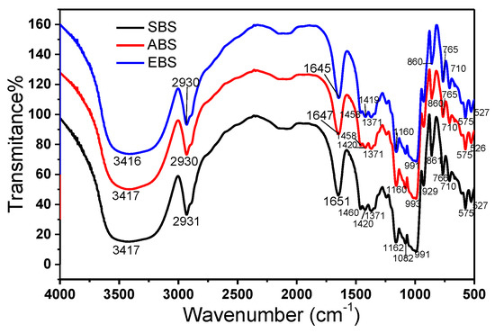 Fourier transform infrared spectra of SBS, EBS and ABS.