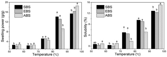 Figure 4 shows the swelling behavior and solubility of SBS, EBS and ABS at different temperatures (55 °C, 65 °C, 75 °C, 85 °C, and 95 °C). The solubility and swelling power were affected by the contents of amylose and amylopectin. Amylopectin contributes to the swelling of starch granules, in contrast, amylose, lipids and proteins inhibit the swelling of starch [35]. Hence, the differences in the structural features that influenced the swelling power would ultimately influence the starch pasting profile. Due to the crystal structure, the starch could be suspended and not easily dissolved in cool water. As the temperature increased, the starch solubility increased because the amylopectin and amylose started to dissociate and dissolve in water. The insoluble starch granules started to swell due to the hydration [36]. The ability of starches to swell in excess water and their solubility also differed (Figure 4). They could be used to assess the extent of interaction between starch chains in the crystalline and amorphous domains [37].