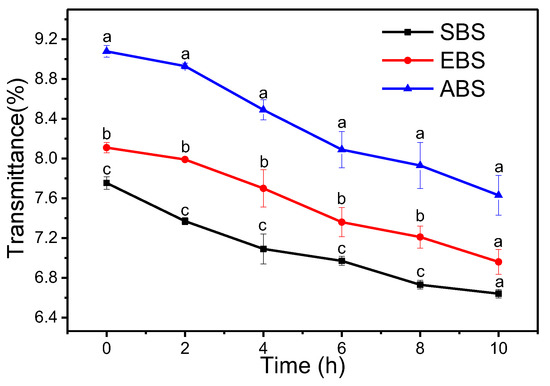 The clarity of starch gels was expressed as light transmittance by measuring the absorbance at 640 nm after fixed intervals of storage period. It is important in food and industrial applications as it affects product quality, in particular its aesthetic attractiveness. ABS presented greater clarity in comparison with EBS and SBS (Figure 5). The greater clarity of ABS can be attributed to the higher value of swelling power and its higher amylose content. Additionally, the low molecular weight, short chains of starch could also facilitate the higher light transmittance [22]. The changes in the granular and molecular structure induced by heating may lead to penetration and absorption of the starch granules, which ultimately results in the higher swelling of starch and thus a greater degree of light transmittance [23]. With the increase in storage time, the paste clarity of different starches decreased due to molecular realignment of solubilized starch chains [22].
