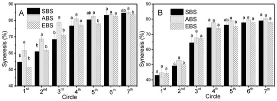 Freeze-thaw stability is an important property, which could be used to evaluate the ability of starch to withstand undesirable physical changes during freezing and thawing. The freeze-thaw stability during freeze-thaw cycles (1st, 2nd, 3rd, 4th, 5th, 6th and 7th) was evaluated with the percentage of syneresis and is exhibited in Figure 6.