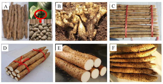 Photographs of six different Dioscorea plants. (A), Dioscoreae opposita Thunb. cv. Tiegun, bulbils were encircled by red circle; (B), Bergamot yam (Hubei Province, China); (C), Dioscoreae opposita Thunb. cv. Ma (Hebei Province, China); (D), Dioscoreae opposita Thunb. cv. Ximao (Shandong Province, China); (E), Dioscoreae opposita Thunb. cv. Jiujinhuang (Shandong Province, China); (F), Dioscoreae opposita Thunb. cv. Dahechangyu (Japanese).