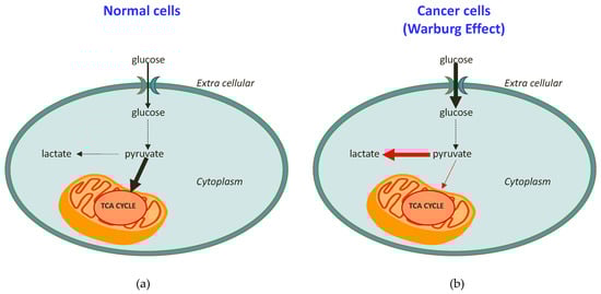 At this regard, it was demonstrated that a hallmark of cancer is represented by a reprogrammed metabolism. This was reported for the first time in the 1920s, thanks to the pivotal research of Otto Warburg showing that the metabolic patterns of cancer cells are generally different from those of normal cells [14]. In brief, normal cells use mitochondria to oxidise glucose and convert glucose into lactate only under hypoxia conditions (Figure 1a). In contrast, cancer cells avidly consume glucose, even in the presence of oxygen, and this is strictly associated with a lactate production increase (and then excretion; Figure 1b), together with the consequent acidic pH of cancer cells [14,15,16]. This discovery, at that time defined as “the root cause of cancer”, and subsequently simply indicated as “the Warburg effect”, won him the Nobel Prize for Medicine [15,16]. By increasing knowledge and scientific research, it was therefore proved that the Warburg effect cannot really be considered “the root cause of cancer”, today known to be determined by a combination of genetic and environmental triggering factors [17]. Nevertheless, the Warburg effect clearly describes how cellular respiration enzymes act in tumour cells, thereby opening new perspectives in the study of cancer [18]. In addition to the better understanding of cancer cells’ physiology, some studies are specifically designed to “reverse the Warburg effect” [19]. This last approach is also believed to be a valid method for pharmacologically acting against cancer. Indeed, several works have targeted the increased glycolysis, with the aim of inhibiting lactate production and excretion [19,20,21,22,23], and have found some success in preclinical models [24,25,26].