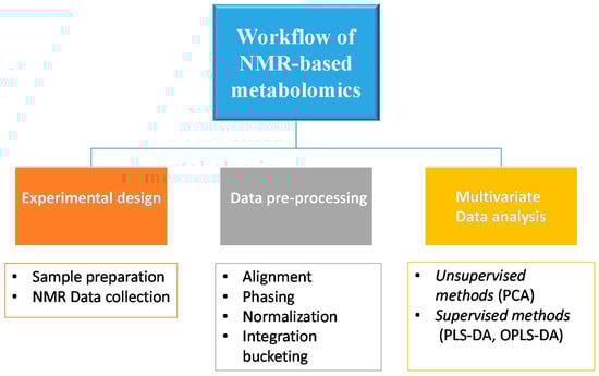 The basic workflow of an NMR-based metabolomic approach starts with experimental design, including the evaluation of appropriate sample numbers to yield informative and statistically significant results, as well as biological and analytical experiments, such as sample preparation and NMR data acquisition. After this, the data preprocessing phase and subsequent data analysis follow. Then the metabolomics study requires the interpretation of the results using a multivariate data analysis, which usually consists of unsupervised and supervised methods (Figure 2).