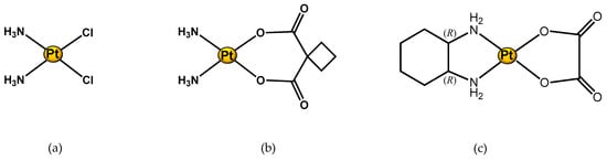 Structure of Pt(II) complexes studied through an 1H NMR metabolomic approach. (a) Cisplatin; (b) Carboplatin; and (c) Oxaliplatin.