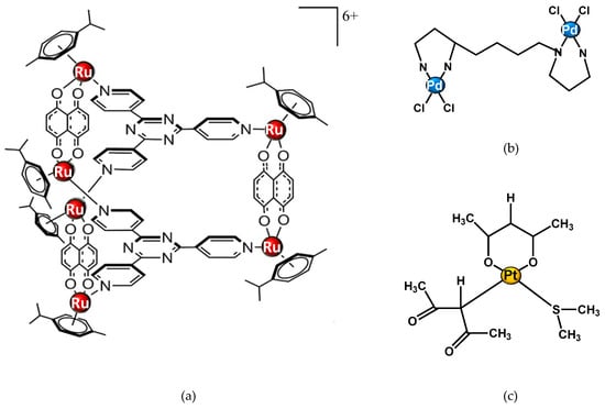 Through the NMR-metabolomics investigation of the effects of approved and widely used metal drugs (such as cisplatin, carboplatin, and oxaliplatin), this new field helps to discover how a new metal drug acts in a biological system, and how to define the specific target of the drug. An example is the study of Vermathen et al. on a new ruthenium complex. They used this technique to profile cells in response to treatment with a hexacationic ruthenium metallaprism (Figure 4a) in three different cell lines: A2780 (human ovarian cancer cells), A2780cisR (cisplatin resistant cells), and HEK-293 (human embryonic kidney cells). This research revealed a different response depending both on the cell type and incubation time. The observed different metabolic profile is mainly due to changes in level expression of lipids, choline-containing compounds, glutamate and glutathione, nucleotide sugars, lactate, and some amino acids. The time-dependent metabolic response patterns suggest that A2780 cells on the one hand, and HEK-293 and A2780cisR cells on the other, may follow different cell-death pathways and exist in different temporal stages thereof [77].