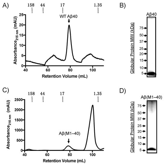 Aβ(M1–40) was expressed using the pET(Aβ1-40) Sac plasmid (provided by D. Walsh) transformed into BL21(DE3)-pLysS competent E. coli. Denatured inclusion bodies from expression lysates were purified by anion-exchange followed by gel filtration chromatography as described previously [25]. Synthetic WT Aβ40 was purified on a preparative Superdex HiLoad 16/60 column and eluted with a retention volume of approximately 80 mL (Figure 1A), which was confirmed to be monomeric by SDS-PAGE analysis (Figure 1B). Aβ(M1–40) also eluted at approximately 80 mL retention volume. The peak in Figure 1C labeled as “Aβ(M1–40)” was collected and the presence of a protein with a molecular weight (MW) of approximately 5 kDa was confirmed using SDS-PAGE (Figure 1D). LC-MS characterization indicated that the purity of both WT Aβ and Aβ(M1–40) were approximately 95% (Supplementary Figures S1–S3). Self-assembly studies were therefore carried out without further purification.