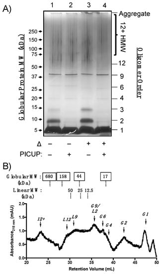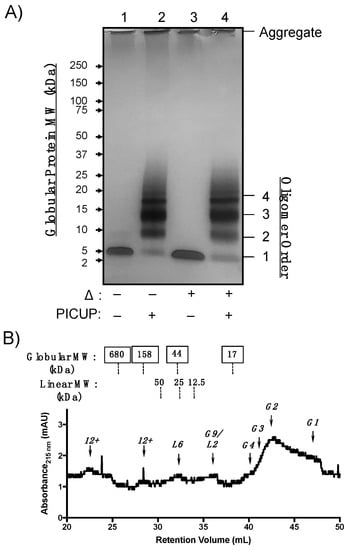 Oligomer photo-induced cross-linking of unmodified proteins (PICUP). Solutions of 1 mM Tris(2,2’-bipyridy)dichloro-ruthenium (II) hexahydrate (Ru(bpy)3Cl2; Sigma Aldrich, 544981) and 20 mM ammonium persulfate (APS, Affymetrix, cat. no. 76322, Santa Clara, CA, USA) were prepared in PBS in 0.5 mL microcentrifuge tubes (0.5 mL, Fisher Scientific basix, cat. no. 02-682-000). Tubes were wrapped in aluminum foil prior to the experiment. Notably, APS was prepared fresh daily. To each tube, 1 µL of 1 mM Ru(bpy)3Cl2 was added followed by 1 µL of 20 mM APS. The sample was mixed thoroughly by pipetting the solution ten times using a 10 uL micropipette. Following mixing, the solution was irradiated with a MagLite™ flashlight light source for 10 s with manual rotation of the microcentrifuge tube around the beam of light. Following light exposure, the reaction was quenched with 8 µL of 3X Laemmli SDS sample buffer containing 20 mM of DTT (Fisher Scientific, cat. no. CX25040) if the samples were to be analyzed by SDS-PAGE. Samples analyzed using analytical size-exclusion chromatography (see below) were quenched with 8 µL of 20 mM DTT in PBS. Following oxidative cross-linking, the tubes were stored at −20 °C pending purification via SEC.