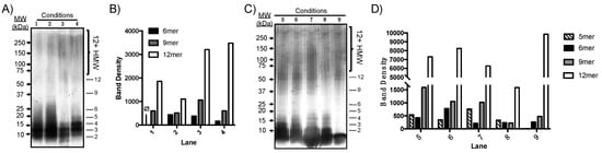 Aβ(M1–40) was incubated at 100 µM in PBS under various conditions listed in Table 1. After PICUP cross-linking, the resultant oligomers were separated on a 12% polyacrylamide gel, which separates HMW species that were not well-resolved by SEC in Figure 3B. After 24 h, samples were cross-linked using PICUP and oligomer dispersity was analyzed by SDS-PAGE (Figure 4A). A qualitative analysis of silver-stained gels showed that most Aβ(M1–40) exists as lower order aggregates ranging from 2mers to 6mers that were not resolvable using the 12% polyacrylamide gels. However, 9mers to 12mers were resolved clearly enough to measure band intensities using densitometry. Tween 20 had the most significant influence on 12mer and HMW oligomer abundances, even after 24 h incubations (lane 3, Figure 4A,B). Figure 4C shows that after 48 h, oligomers were more polydisperse, though only 5mers–12mers could be resolved for quantification using densitometry. Relative oligomer abundances after 48 h compared to those after 24 h incubations, with the exception of 12mers that were present at levels nearly six-fold higher than any other assembly state, regardless of whether Tween 20 was added. In the absence of PICUP (lane 9), only 12mers were detected in significant quantities when co-incubated with Tween 20. Co-incubation of Aβ(M1–40) with SDS inhibited assembly of 12mers and other HMW oligomers (lane 8). Therefore, co-incubation with Tween 20 has a stabilizing effect on unmodified HMW, but not LMW, oligomers.
