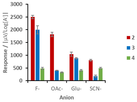 Given that the highest responses in terpolymers 2 and 3 occurred when these systems were exposed to a fluoride anion, we determined—as a further step—the selectivity values of the polymers 2–4 using this ion as the target guest and the remaining three ions as interfering anions (see Figure 3). The results showed that for terpolymer 2, selectivity between fluoride and acetate was logarithmically negligible. However, gluconate and thiocyanate afforded the highest discrimination values, since the anion SCN− provided the most marked selectivity with fluoride (a higher distance from the F− reference). Contrarily, terpolymer 3 showed that a higher selectivity was achievable for fluoride vs. the whole set of interfering anions when the Zn-Salphen monomer content was raised from 2% wt. to 4% wt. In this case, the highest selectivity was also achieved against SCN−. Nonetheless, gluconate showed the closest value to the reference guest, instead of acetate (as in 2). As a reference, a similar analysis carried out for blank copolymer 4 showed that no selectivity was achieved for F− against thiocyanate, whereas a minor selectivity arose vs. gluconate and a slightly more pronounced discrimination occured vs. acetate. However, this value is still logarithmically negligible.