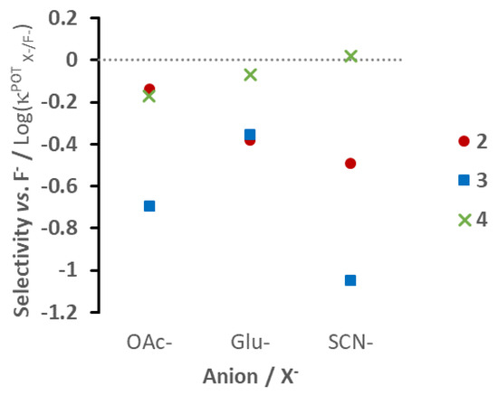 Relative selectivity, Log(κPOTX-/F-), obtained with each polymer (2–4), estimated for F− vs. each anion X−, where the gray horizontal dashed line is the reference value for the fluoride target guest.